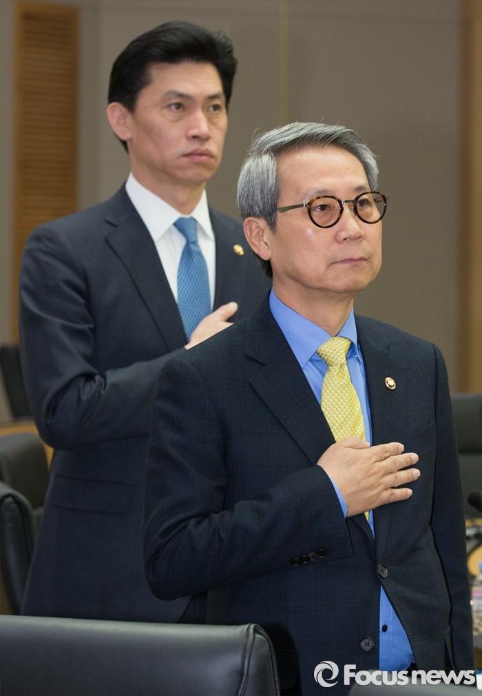 (세종=포커스뉴스) 이근면 인사혁신처장이 19일 오전 세종시 정부세종청사 국무회의장에서 서울-세종 영상회의로 열린 국무회의에 참석해 국기에 대한 경례를 하고 있다.