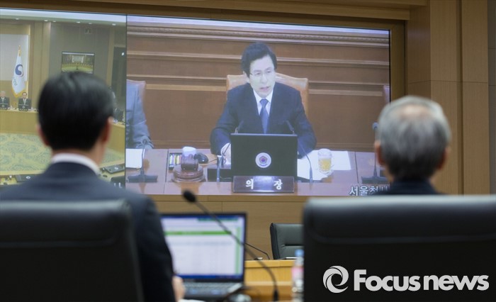 (세종=포커스뉴스) 19일 오전 세종시 정부세종청사 국무회의장에서 서울-세종 영상회의로 열린 국무회의에 참석한 국무위원들이 황교안 총리의 모두발언을 경청하고 있다.