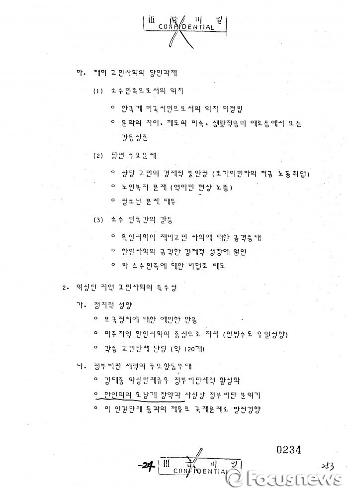 이밖에도 정부비판 교포언론으로 '한국신보' '독립신문' '자유신문' '미주 매일' 등을 언급하고 발행인 등을 명기했다.외교부가 17일 공개한 1985년도 북미 외교문서. 2016.04.17. <사진출처=외교부>외교부가 17일 공개한 1985년도 북미 외교문서. 워싱턴 지역 교민사회에 대한 성향이 정부 비판적이라고 언급돼 있다. 2016.04.17. <사진출처=외교부>외교부가 17일 공개한 1985년도 북미 외교문서. 워싱턴 지역 정부 비판세력에 관한 분석이 나타나 있다. 2016.04.17. <사진출처=외교부>외교부가 17일 공개한 1985년도 북미 외교문서. 정부비판 세력으로 목요기도회와 호남향우회가 언급돼 있다. 2016.04.17. <사진출처=외교부>