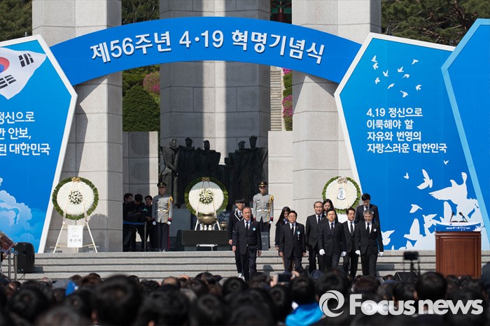 (서울=포커스뉴스) 19일 오전 서울 강북구 국립 4.19 민주묘지에서 열린 '제56주년 4.19혁명 기념식'에서 황교안 국무총리가 헌화를 마치고 자리로 돌아가고 있다.