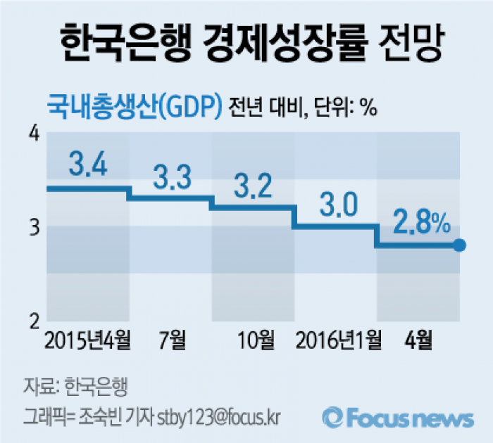 (서울=포커스뉴스) 19일 한국은행은 올해 경제성장률 전망치를기존 3.0%에서 2.8%로 낮춘다고 밝혔다.