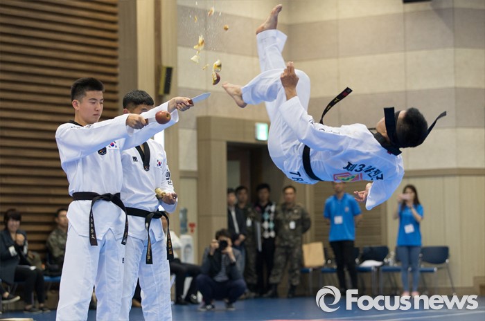 (서울=포커스뉴스) 19일 오후 서울 용산구 국방부 다목적홀에서 국방부 태권도 시범단이 한국문화 체험행사에 참가한 주한미군 장병들에게 시범을 선보이고 있다.