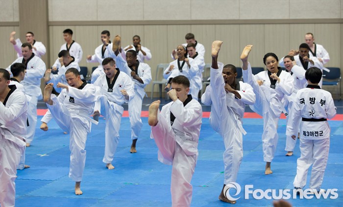 (서울=포커스뉴스) 19일 오후 서울 용산구 국방부 다목적홀에서 한국문화 체험행사에 참가한 주한미군 장병들이 태권도를 배우고 있다.