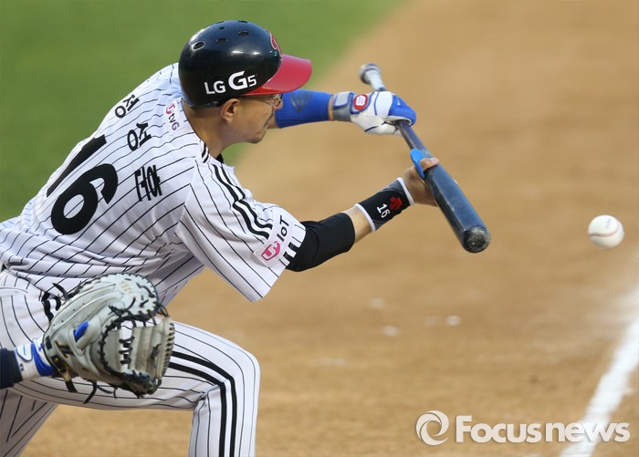 (서울=포커스뉴스) 19일 서울 잠실구장에서 열린 2016 프로야구 NC-LG 경기 1회말 무사 1,2루에서 LG 정성훈이 보내기 번트를 하고 있다.