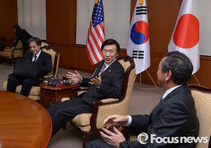 (서울=포커스뉴스) 윤병세 외교부 장관이 19일 오후 서울 종로구 외교부에서 열린 한미일 외교차관 접견에서 사이키 아키타카 일본 외무성 사무차관과 대화를 나누고 있다.
