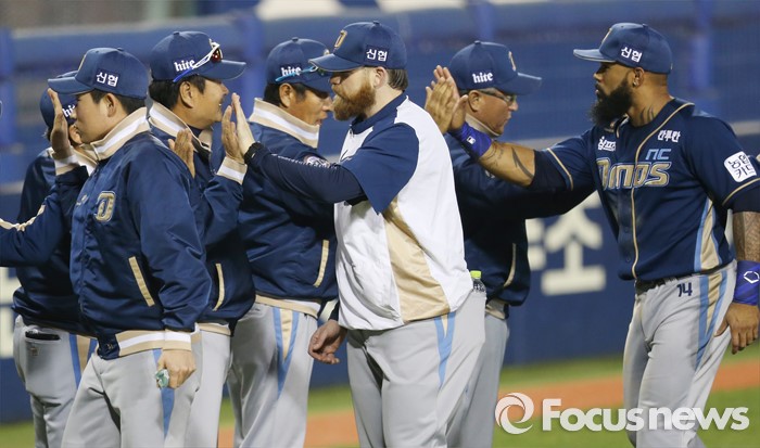 (서울=포커스뉴스) 19일 서울 잠실구장에서 열린 2016 프로야구 NC-LG 경기에서 LG에 승리한 NC 김경문 감독이 선수들과 하이파이브하고 있다.