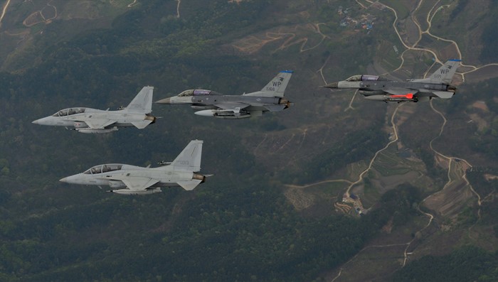 (서울=포커스뉴스) 지난 15일부터 오는 29일까지 전북 군산 비행장에서 실시되고 있는 한·미 공군 대규모 항공전역훈련인 맥스썬더 훈련에서 7공군사령관 테런스 오셔너시 중장은 우리 공군의 FA-50 전투기(선두기)를, 작전사령관 이왕근 중장은 미공군의 F-16전투기(앞에서 세번째)를 탑승해 공중에서 작전을 지휘하고 있다. <사진제공=공군>