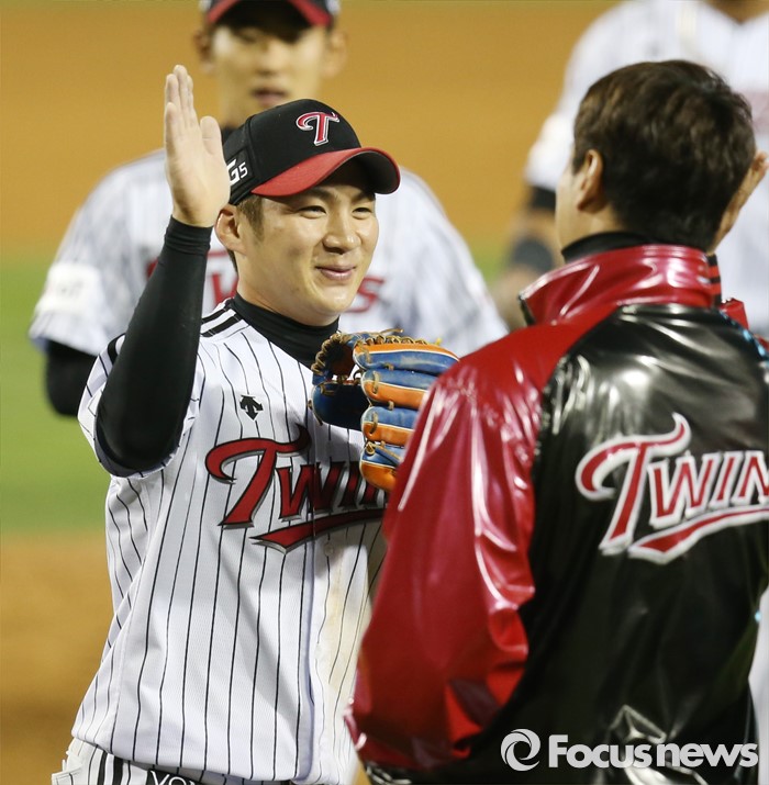 (서울=포커스뉴스) 20일 서울 잠실구장에서 열린 2016 프로야구 NC-LG 경기에서 NC를 6-3으로 물리친 후 LG 오지환이 하이파이브를 하고 있다.