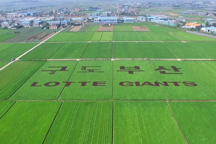 또 21일 사직 한화전을 '농촌진흥청 매치데이'로 펼친다. 이양호 농촌진흥청장과 농민 대표 박대조 씨가 시구자와 시타자로 참여한다. 팬들에게 농촌진흥기관이 기술과 사업을 지원한 가공식품인 도라지즙, 발효식초 등을 이벤트 경품으로 지급한다. 식물 기르기 세트(씨앗 및 기르기 도구) 5000개도 선착순 배포한다.프로야구 롯데가 농촌진흥청과 함께 '논ART' 사업을 펼친다. 사진은 지난 시즌 진행한 '논ART' 전경. <사진제공=롯데 자이언츠>