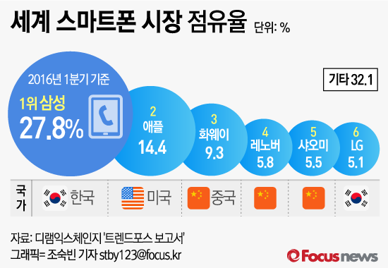 (서울=포커스뉴스) 21일 시장조사기관 디램익스체인지의 트렌드포스 보고서에 따르면 올해 1분기 기업별 스마트폰 점유율 순위는 삼성이 27.8%로 1위, 애플이 14.4%로 2위를 차지한 것으로 나타났다.