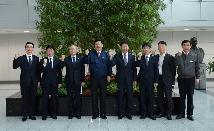 (청주=포커스뉴스) 주형환 산업통상자원부 장관이 21일 오전 충북 청주 오창과학산업단지에 위치한 LG화학 오창공장을 방문, 공장시설물을 둘러보고 기념촬영하고 있다. <사진제공=산업통상자원부>