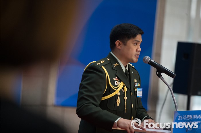 (서울=포커스뉴스) 21일 오후 서울 용산구 전쟁기념관에서 열린 6.25 전쟁영웅 선정패 수여식에서 전쟁영웅으로 선정된 태국인 아따난 손자가 기념사를 하고 있다.