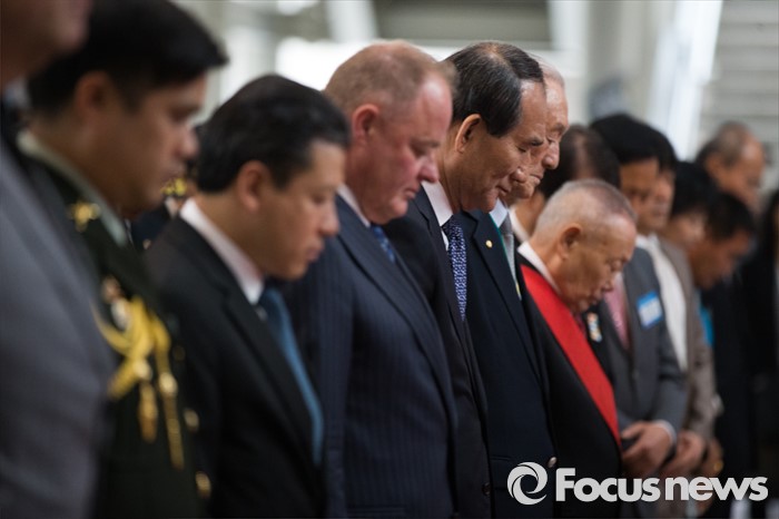 (서울=포커스뉴스) 21일 오후 서울 용산구 전쟁기념관에서 열린 6.25 전쟁영웅 선정패 수여식에서 박승춘 국가보훈처장과 참전용사들이 묵념을 하고 있다.
