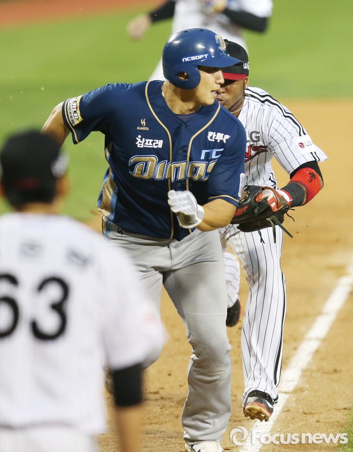 (서울=포커스뉴스) 21일 서울 잠실구장에서 열린 2016 프로야구 NC-LG 경기 3회초 무사 1루에서 NC 테임즈의 우익수 오른쪽에 떨어지는 2루타때 1루주자 나성범이 3루에서 오버런하며 LG 3루수 히메네스에게 태그아웃되고 있다.
