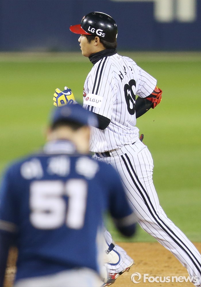 (서울=포커스뉴스) 21일 서울 잠실구장에서 열린 2016 프로야구 NC-LG 경기 4회말 1사후 LG 서상우가 NC 투수 이재학의 초구를 받아쳐 좌중월 1점 홈런을 치고 베이스를 돌고 있다.