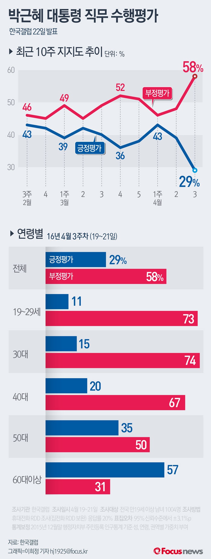 (서울=포커스뉴스) 한국갤럽이 22일 발표한 여론조사 결과에 따르면 박근혜 대통령의 직무 수행에 대해 '잘하고 있다'고 답한 비율은 29%, '잘못하고 있다'는 58%에 달했다.