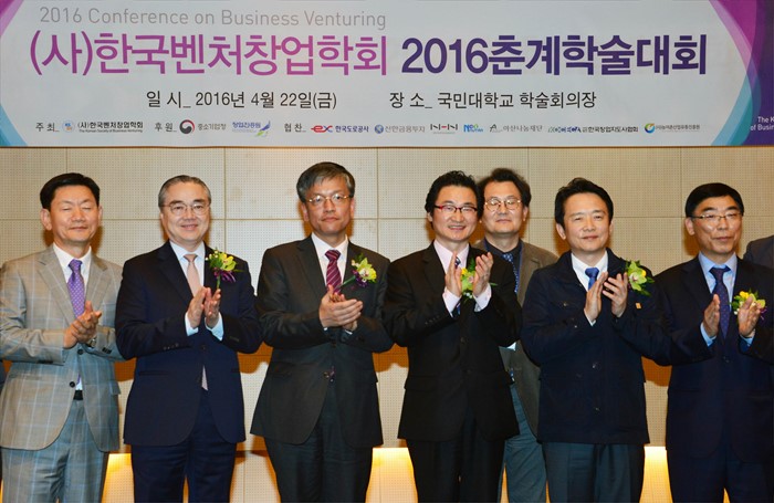 (서울=포커스뉴스) 최상목 기획재정부 차관이 22일 서울 성북구 국민대학교에서 열린 한국벤처창업학회 춘계학술대회에 참석해 남경필 경기도지사 등 참석자들과 기념촬영을 하고 있다. <사진제공=기획재정부>