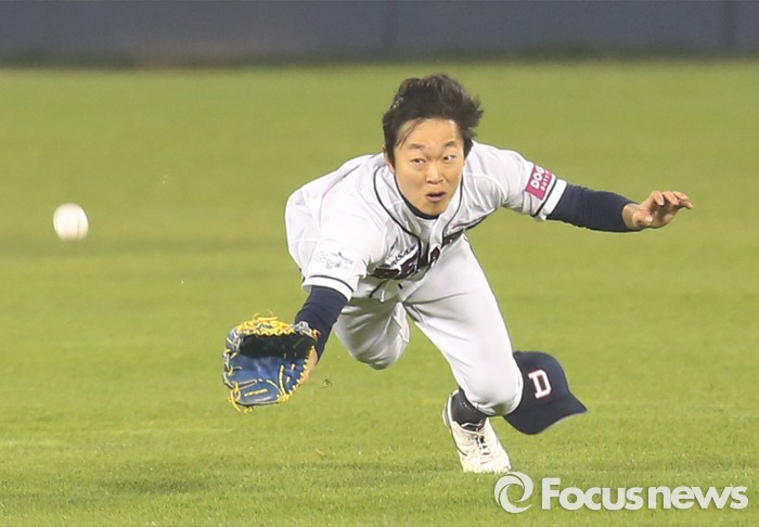 (서울=포커스뉴스) 22일 서울 잠실구장에서 열린 2016 프로야구 한화-두산 경기 5회초 2사 2루에서 두산 중견수 정수빈이 한화 정근우의 중전안타를 잡으려 다이빙하고 있다.
