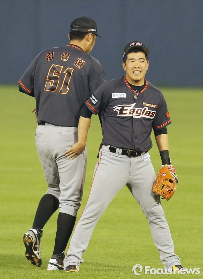 (서울=포커스뉴스) 22일 서울 잠실구장에서 열린 2016 프로야구 한화-두산 경기 6회말 2사 1루에서 한화 2루수 정근우가 두산 양의지에게 텍사스성 안타를 내준 후 우익수 김경언의 엉덩이를 두드리며 아쉬워하고 있다.