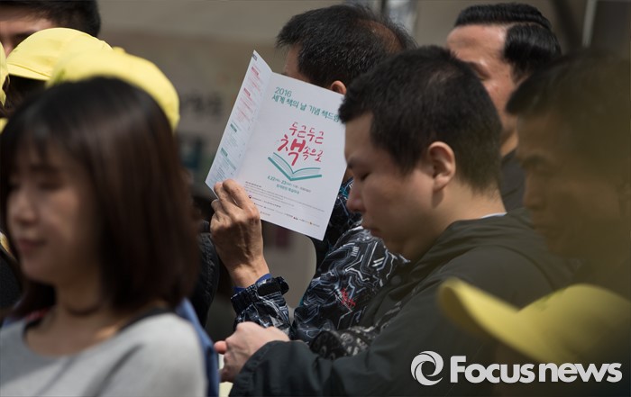 (서울=포커스뉴스)유네스코가 1995년 제정한 ‘세계 책과 저작권의 날’인 23일 오전 서울 중구 청계광장에서 열린 2016 세계 책의 날 기념 책드림 행사 '두근두근 책 속으로'에서 시민들이 개막식을 보고 있다.