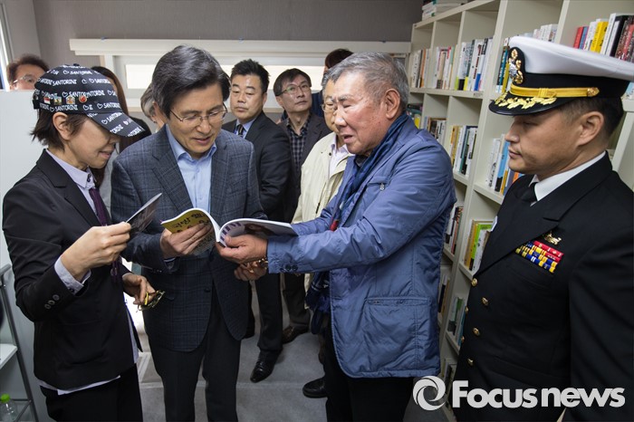 (서울=포커스뉴스)유네스코가 1995년 제정한 ‘세계 책과 저작권의 날’인 23일 오전 서울 중구 청계광장에서 열린 2016 세계 책의 날 기념 책드림 행사 '두근두근 책 속으로'에서 황교안 국무총리(왼쪽 두번째)가 병영독서카페에서 책을 보고 있다.