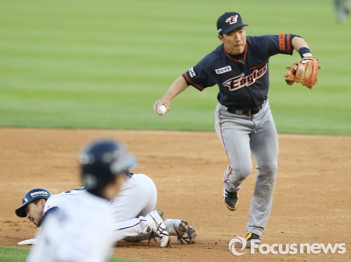 (서울=포커스뉴스) 24일 서울 잠실구장에서 열린 2016 프로야구 한화-두산 경기 5회말 1사 만루에서 한화 2루수 정근우가 두산 건우의 타구를 잡아 1루주자 오재원을 태그아웃 시킨후 1루로 송구해 타자 주자도 잡아 병살을 성공시키고 있다.