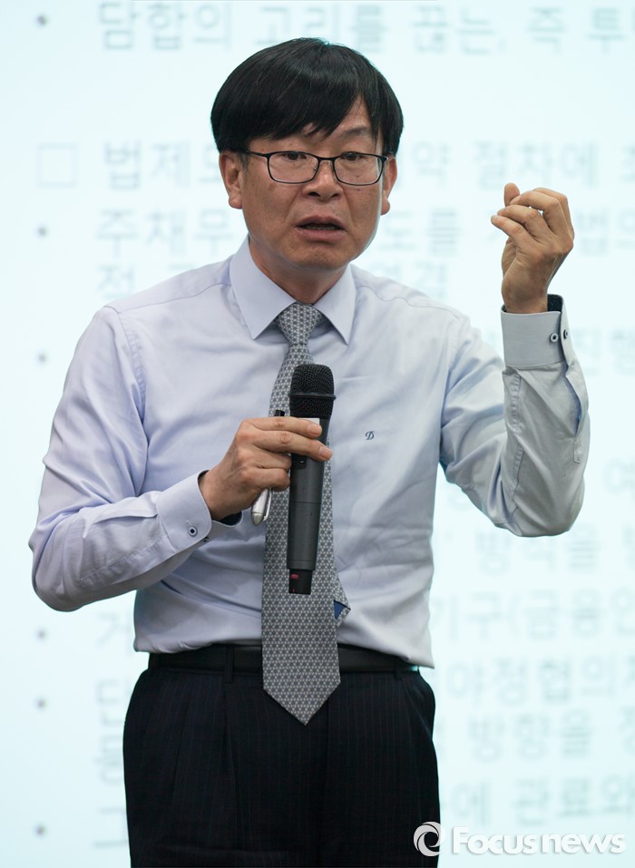 (양평=포커스뉴스) 김상조 한성대학교 교수가 26일 오후 경기도 양평 한화리조트에서 열린 국민의당 20대 총선 당선인 워크숍에 참석해 '한국경제 현황 및 국회 과제'란 주제로 강연하고 있다.
