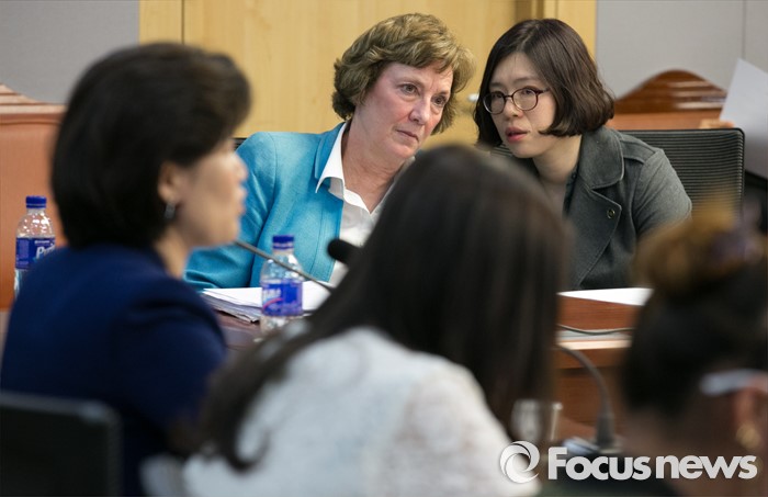(서울=포커스뉴스) 26일 오후 서울 여의도 국회 의원회관에서 북한자유주간 주최, 통일맘연합 주관으로 열린 중국과 제3국에서 자녀와 헤어진 탈북여성들의 호소, '내 아이를 안고 싶어요' 증언대회에 참석한 수잔 숄티 북한자유연합 대표가 여성들의 증언을 듣고 있다.