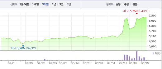 이달 초 주가(4975원)와 비교했을 때 47.3% 상승한 수치다. 시가총액은 2786억원으로 이달 초(1883억)와 비교했을 때 903억이나 늘어났다.