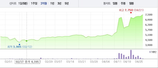 보성파워텍의 주가는 18일 17.8%의 하락폭을 기록한 이우 쭉 상승세를 이어왔다. 21일에는 외국인의 매수로 상승폭 16.91%를 기록했다.