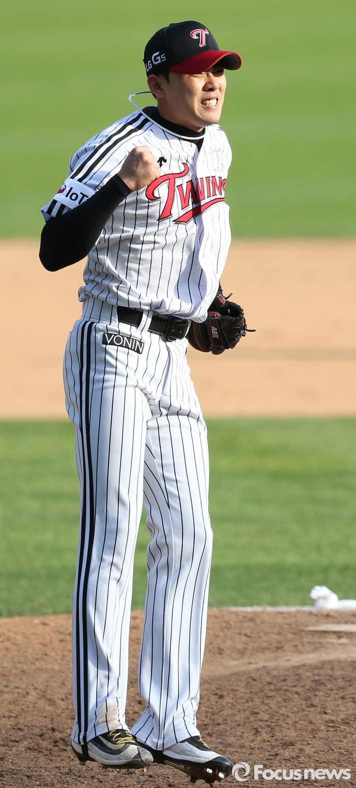 (서울=포커스뉴스) 1일 서울 잠실구장에서 열린 2016 프로야구 kt-LG 경기에서 세이브를 따낸 LG 투수 임정우가 kt 마지막 타자 하준호를 삼진으로 잡고 주먹을 쥐며 기뻐하고 있다.