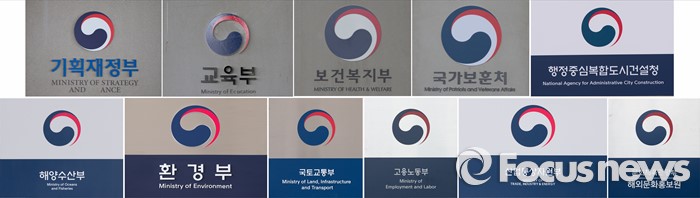 (세종=포커스뉴스) 25일 오전 세종시 정부세종청사 부처 입구에 설치된 정부부처 상징로고가 부처별 다른 모습을 보이고 있다.