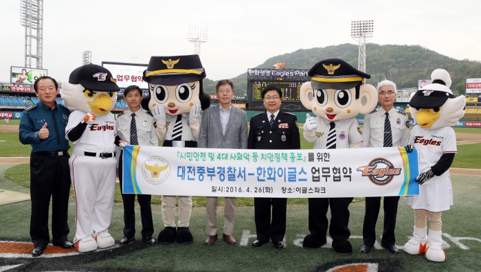한화는 대전중부경찰서와 민관협력, 지역사회 공헌을 위해 '시민안전과 4대 사회악 근절'에 뜻을 함께하기로 했다. 한화는 구장 내 전광판을 통해 '4대 사회악 근절' '응답순찰' '3초의 여유' 등 치안정책을 알린다.