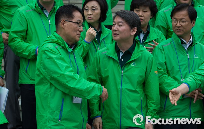 (양평=포커스뉴스) 안철수 국민의당 상임공동대표와 박지원 원내대표가 27일 오전 경기도 양평 한화리조트에서 열린 20대 총선 당선자 워크숍에서 선언문 낭독 후 대화를 나누고 있다.