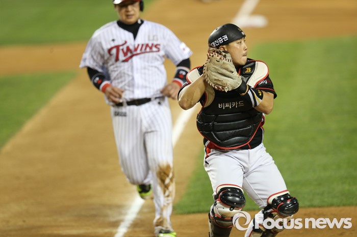 (서울=포커스뉴스) 29일 서울 잠실구장에서 열린 2016 프로야구 kt-LG 경기 5회말 1사 만루에서 LG 박용택의 1루 땅볼때 kt 포수 김종민이 3루주자 정상호를 홈에서 포스 아웃시키고 1루 송구를 시도하고 있다.