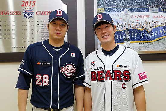 두산 선수단은 올시즌 유니폼 가슴 상단에 '한국타이어' 로고 자수 광고를 부착하고 뛴다. 또 홈경기 전광판에서 한국타이어 영상 광고도 방영한다. '한국타이어 스폰서데이'로 프로모션 이벤트를 펼친다.프로야구 두산이 한국타이어와 광고 프로모션 계약을 체결했다. 두산 장원준(왼쪽)과 김재호가 '한국타이어' 로고 자수 광고가 부착된 유니폼을 입고 포즈를 취하고 있다. <사진제공=두산 베어스>