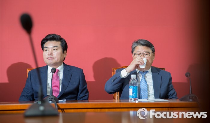 (서울=포커스뉴스) 원유철(왼쪽) 새누리당 대표최고위원 권한대행과 조원진 원내수석부대표가 2일 오전 서울 여의도 국회에서 열린 마지막 원내대책회의에 참석하고 있다.