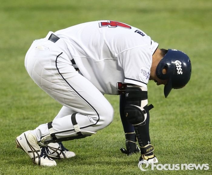 | △ 발에 공 맞은 오재원 |