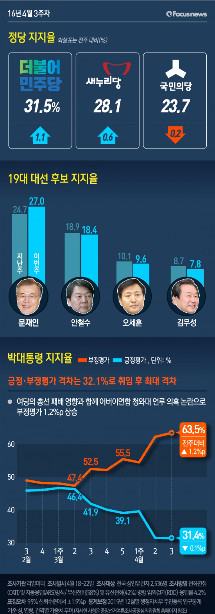 이번 2016년 4월 3주차 주간집계는 18일부터 22일까지 5일간 전국 19세 이상 유권자 2,536명을 대상으로 전화면접(CATI) 및 자동응답(ARS) 방식으로 무선전화(58%)와 유선전화(42%) 병행 임의걸기(RDD) 방법으로 조사했고, 응답률은 4.2%(총 통화 60,381명 중 2,536명 응답 완료)이다. 통계보정은 2015년 12월말 행정자치부 주민등록 인구통계 기준 성, 연령, 권역별 가중치 부여 방식으로 이루어졌고, 표본오차는 95% 신뢰수준에서 ±1.9%p이다. 일간집계는 ‘2일 이동 시계열(two-day rolling time-series)’ 방식으로 18일 1,012명, 19일 1,015명, 20일 1,016명, 21일 1,014명, 22일 1,012명을 대상으로 실시했고, 응답률은 18일 4.1%, 19일 4.4%, 20일 4.1%, 21일 4.3%, 22일 4.1%, 표집오차는 5일간 모두 95% 신뢰수준에서 ±3.1%p이다. 일간집계의 통계보정 방식은 주간집계와 동일하다.