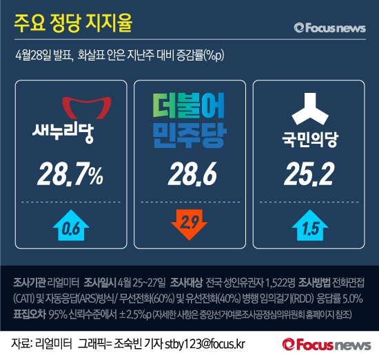 (서울=포커스뉴스) 여론조사기관 리얼미터가 25일부터 27일까지 3일간 실시, 28일 발표한 여론조사에 따르면 새누리당은 지난주 조사 대비 0.6%p 상승한 28.7%를 기록했으며, 더민주는 지난주 대비 2.9%p 하락한 28.6%로 오차 범위 내 2위로 내려앉았다. 국민의당은 1.5%p 상승한 25.2%로 지지율이 계속 상승 국면인 것으로 나타났다.