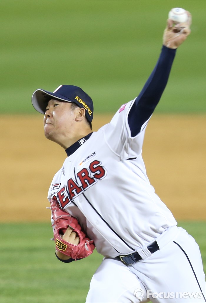 (서울=포커스뉴스) 26일 서울 잠실구장에서 열린 2016 프로야구 SK-두산 경기 8회초 무사 1루에서 두산 마무리 투수 이현승이 마운드에 올라 투구하고 있다.