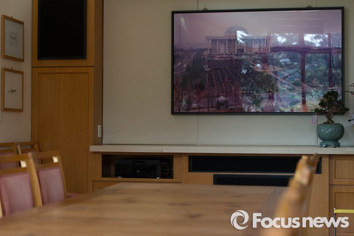 (김해=포커스뉴스) 고 노무현 전 대통령 서거 7주기를 앞두고 1일 오전 노 전 대통령의 사저가 공개되고 있다. 사랑채 한쪽 벽면에 노무현 전 대통령의 취임식 사진이 걸려있다.