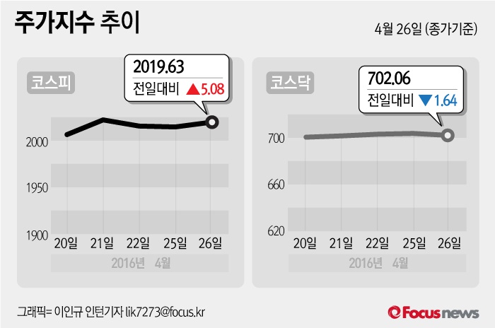 (서울=포커스뉴스) 26일 코스피지수는 전날 보다 0.25%(5.08포인트) 오른 2019.63에 장을 마쳤다. 코스닥지수는 전일 대비 0.23%(1.64포인트) 내린 702.06에 마감했다.