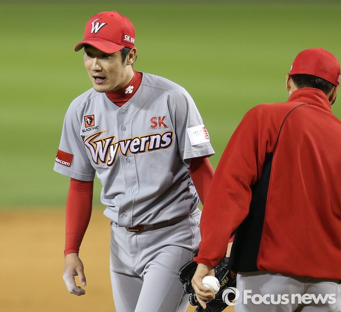 (서울=포커스뉴스) 27일 서울 잠실구장에서 열린 2016 프로야구 SK-두산 경기에서 6.2 이닝을 무실점으로 막은 SK 투수 박종훈이 마운드를 내려가고 있다.