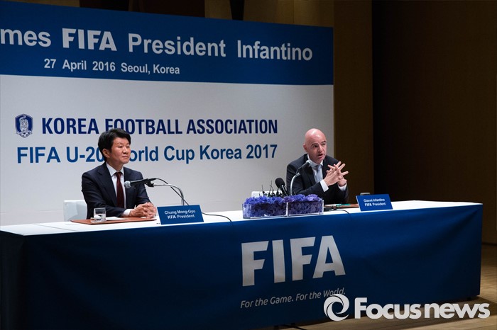 (서울=포커스뉴스) 한국을 방문한 지아니 인판티노(46, 스위스) FIFA 회장과 정몽규 대한축구협회장이 27일 오후 서울 강남구 아이파크타워에서 열린 기자회견에 참석해 있다.