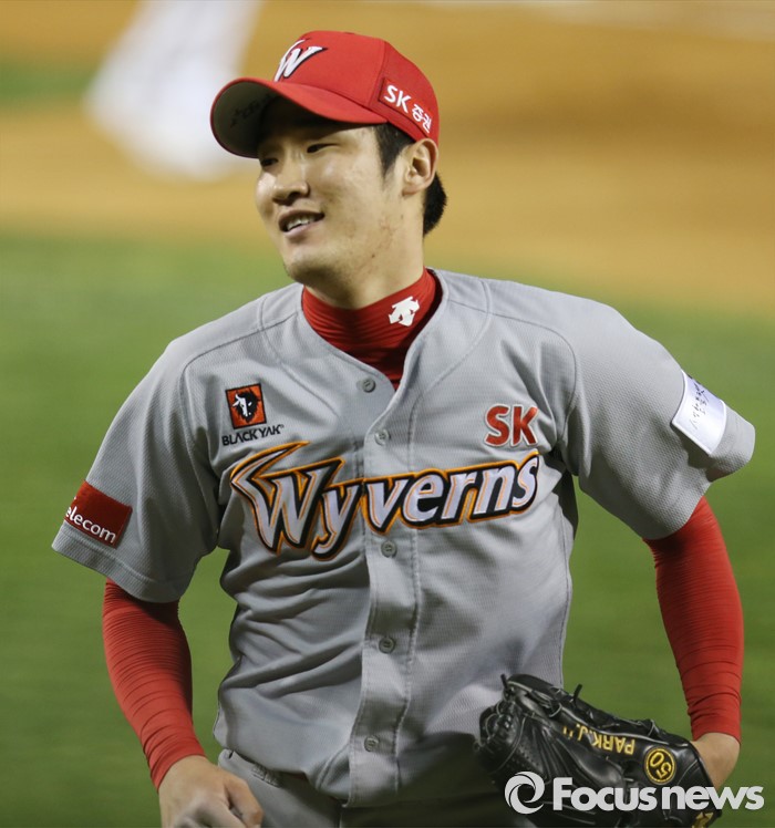 (서울=포커스뉴스) 27일 서울 잠실구장에서 열린 2016 프로야구 SK-두산 경기 5회말 2사 만루에서 SK 박종훈이 두산 허경민을 삼진 아웃시키며 위기 상황에서 탈출하며 밝은 표정으로 덕아웃으로 향하고 있다.