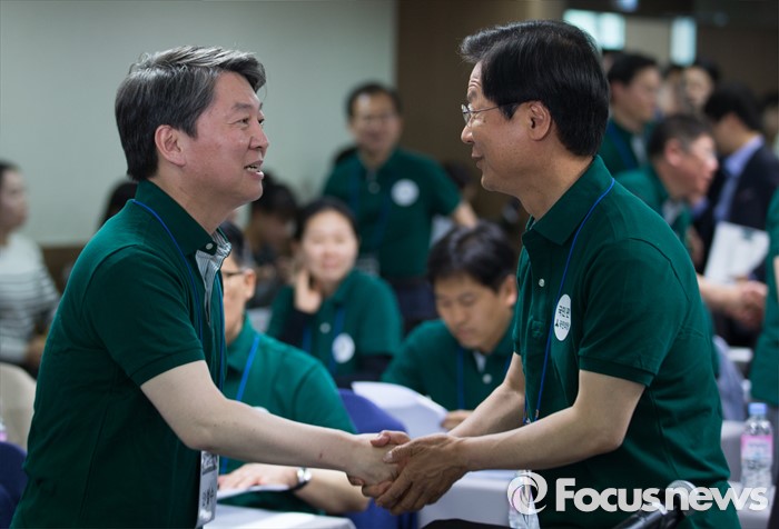 (양평=포커스뉴스) 안철수(왼쪽) 국민의당 상임공동대표와 천정배 공동대표가 26일 오후 경기도 양평 한화리조트에서 열린 20대 총선 당선인 워크숍에 참석해 악수하고 있다.