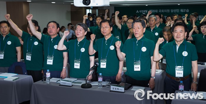 (양평=포커스뉴스) 안철수(왼쪽 네번째) 국민의당 상임공동대표와 천정배(오른쪽 세번째) 공동대표와 20대 총선 당선인들이 26일 오후 경기도 양평 한화리조트에서 열린 워크숍에 참석해 파이팅을 외치고 있다. 왼쪽부터 이용주, 박지원, 장병완, 안 대표, 천 대표, 주승용, 정동영 당선인.