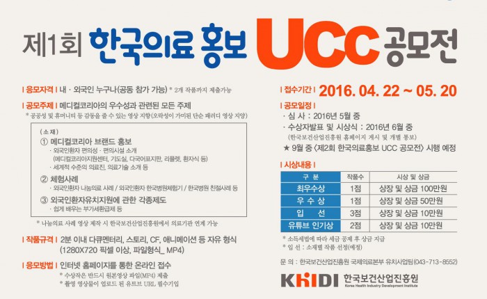 (서울=포커스뉴스) 한국보건산업진흥원(원장 이영찬, 이하 진흥원)은 한국의료의 세계적 브랜드화를 위해 양질의 한국의료를 알릴 수 있는 ‘제1회 한국의료 홍보 UCC 공모전’을 개최한다고 27일 밝혔다.