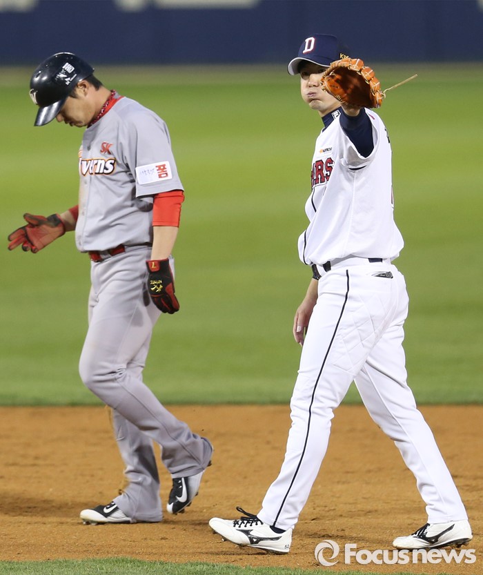 (서울=포커스뉴스) 28일 서울 잠실구장에서 열린 2016 프로야구 SK-두산 경기 4회초 1사 1루에서 두산 유격수 김재호가 2루 도루를 시도한 SK 박재상을 아웃시킨후 포수 양의지의 정확한 송구를 치하하고 있다.